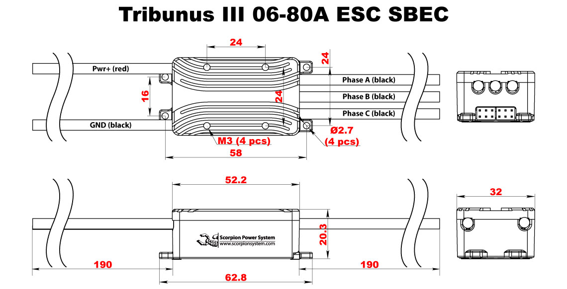 Scorpion Tribunus III 第三代電子變速,新的美觀外觀、帶有封閉式電容器的新外殼設計、黑色和金色陽極處理 2 種色調,容易安裝的安裝座及更好的抗碰撞能力,改進的 PCB 設計和冷卻技術可大幅降低工作溫度並提高 ESC 的額定功率,產品使用壽命更長.