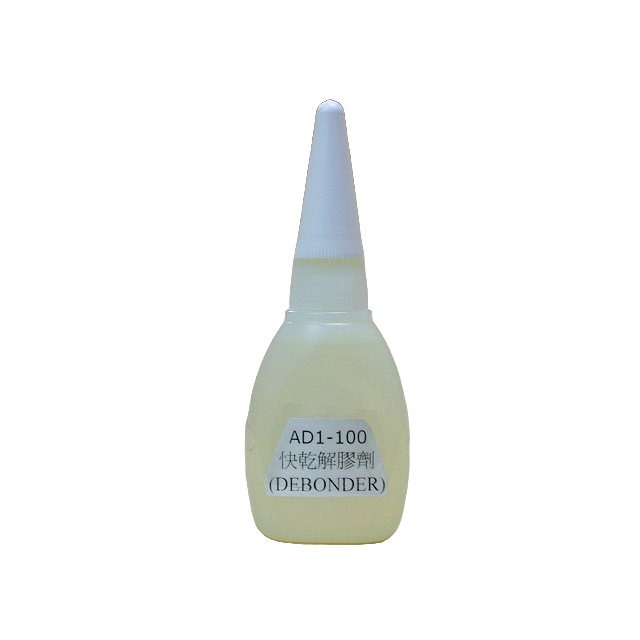 去除瞬間膠 快乾膠 三秒膠。 表面處理乾淨,塗抹適量之解膠劑於固化之膠水上,需完全覆蓋,視面積大小及厚度決定時間長短,通常約幾分鐘待其軟化後,以適當工具刮除及微濕的布擦除即可,若厚度較厚,可重複多次處理。