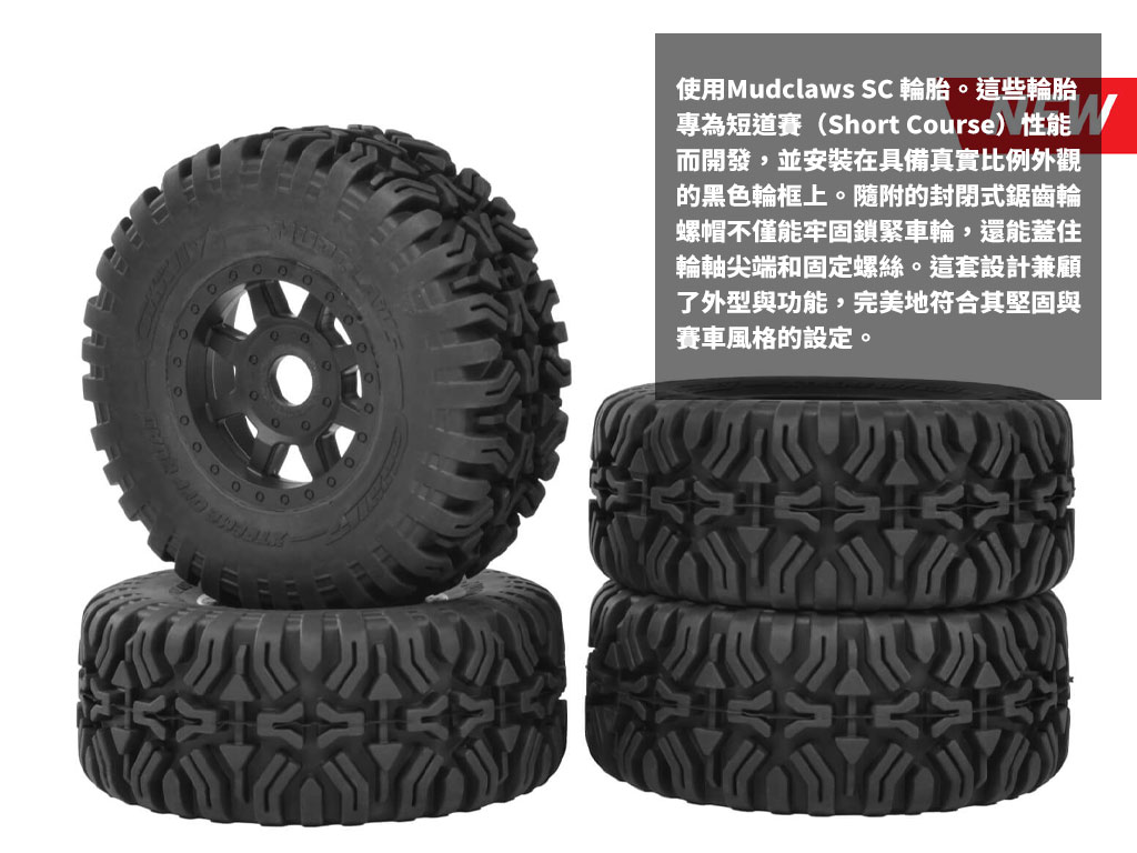 ✅ 仿真外觀:防滾架、完整內裝、專屬 Mudclaws SC 輪胎,帥到不像模型車
