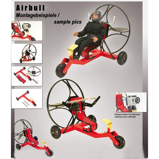 Hacker Airbull 新型的動力三輪機架提供多種飛行樂趣的選擇, 這機架的設計非常的美觀堅固, 它可以不搭載飛行員使用機架上安裝的伺服機或搭載飛行員使用或不使用駕駛員的手臂來控制飛行, 這新型機架被設計如果不搭載飛行員可用來搭載 GoPro 運動型攝影機空拍用, 由於不搭載飛行員這多出來的空間對於搭載 GoPro運動型攝影機空拍飛行時的重心調整非常方便.