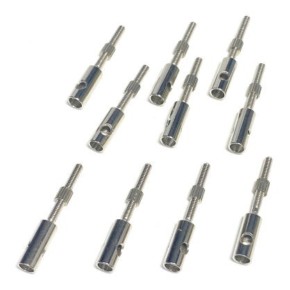 ♦ 此轉接頭可轉接 3.2mm 的碳纖棒及其它拉桿或鋼索, 需用烙鐵焊接或上膠, 另一端有螺牙部分長 15mm, 螺牙為 M2.0, 可搭配市面上多數的耐龍及金屬連桿頭使用, 一包 10 個含 2mm 螺母.