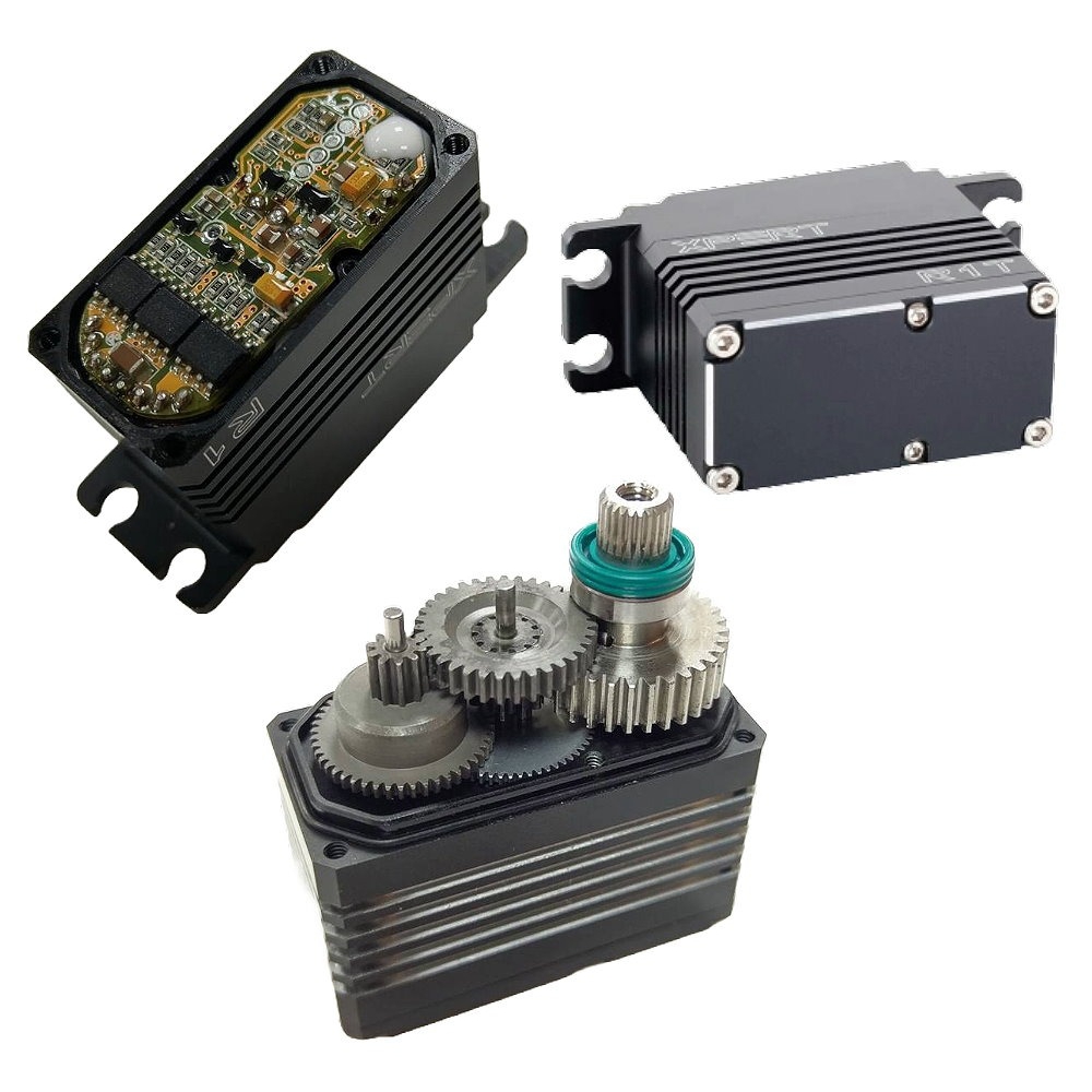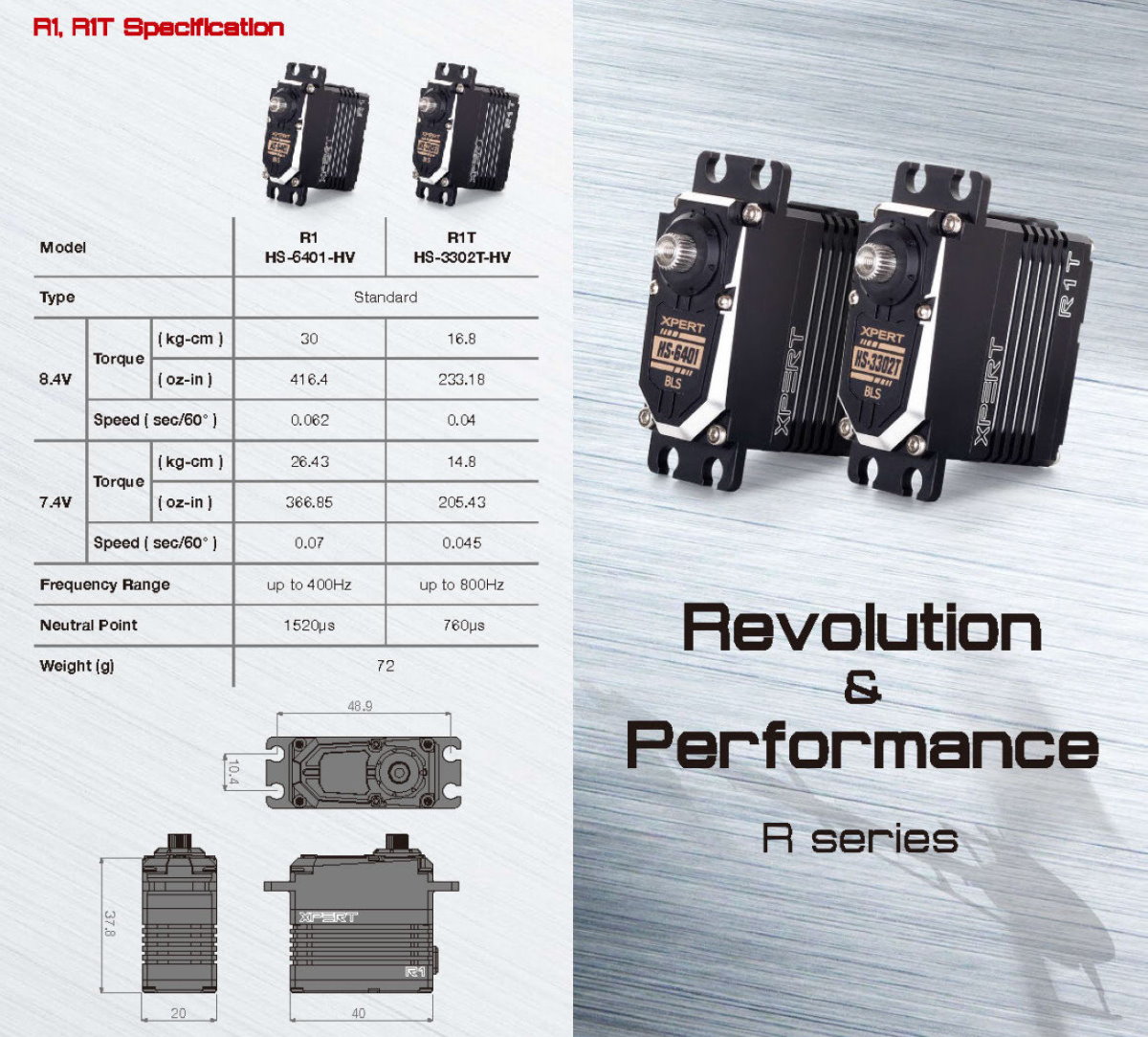 R1、R1T,這兩款R系列的伺服機分別是針對使用在控制十字盤(R1)與控制尾舵(R1T)上面。外殼全部採用鋁合金材料,搭配黑色陽極處理與局部削邊加工和雷射字樣雕刻、金色型號銘版,整體呈現出極具格調的高品味美感。