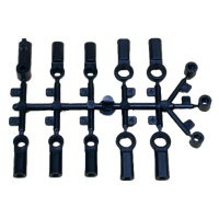 這球軸用拉桿頭適合 3mm 螺牙的拉桿及 4.8mm 和 5.8mm 的球軸使用, 內含 4.8mm 球軸用拉桿頭五個, 5.8mm 球軸用連桿頭四個, 還包含一個軸套拉桿頭 (軸套內徑 2.5mm, 長度 8mm), ID 3mm x OD 5.4mm x 5.2mm 軸套一個, ID 3mm x OD 5.4mm x 5.5mm 軸套一個, ID 3mm x OD 5.4mm x 6.0mm 軸套一個.